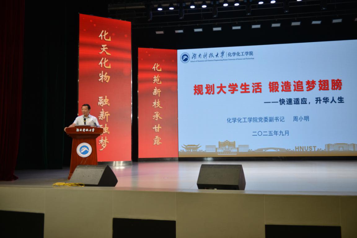 院党委副书记周小明围绕“规划大学生活,锻造追梦翅膀——快速适应,升华人生”主题作补充讲话。他紧扣新生现实需求,深入浅出地阐述了“适应”与“规划”的紧密联系,指出快速适应是顺利开启大学生活的基础,而科学规划则是实现自我超越和人生跃升的关键。